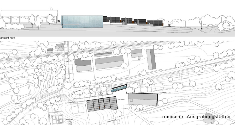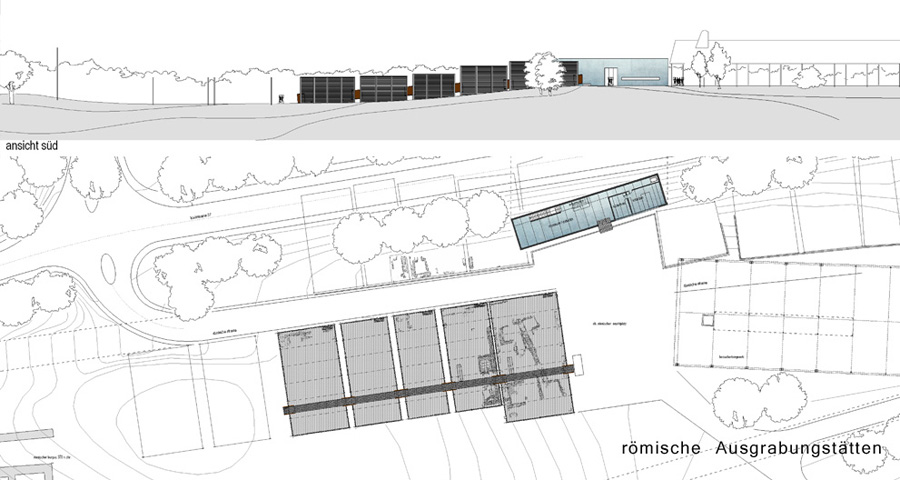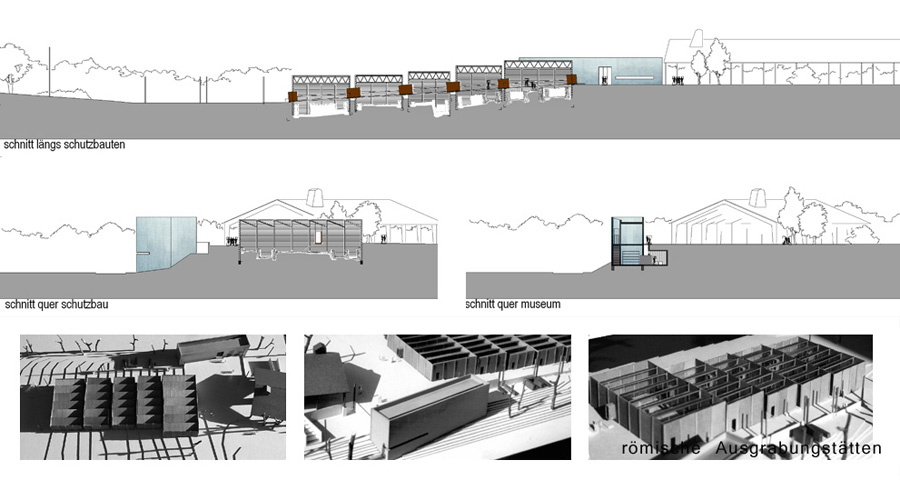 Neubauplanung eines römischen Museums mit zugehörigen Schutzbauten über den Ausgrabungsstätten.