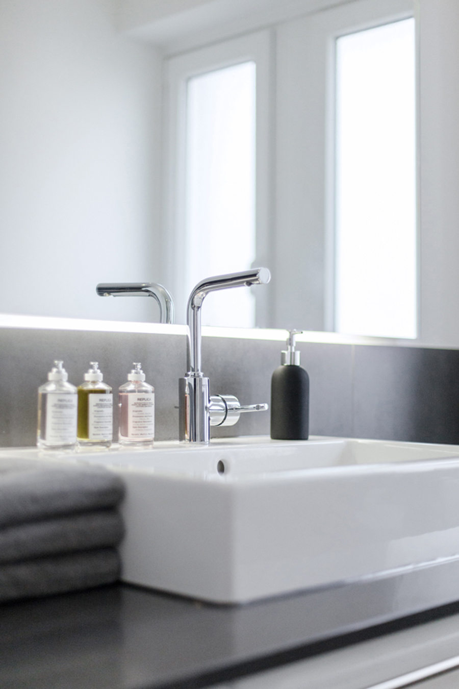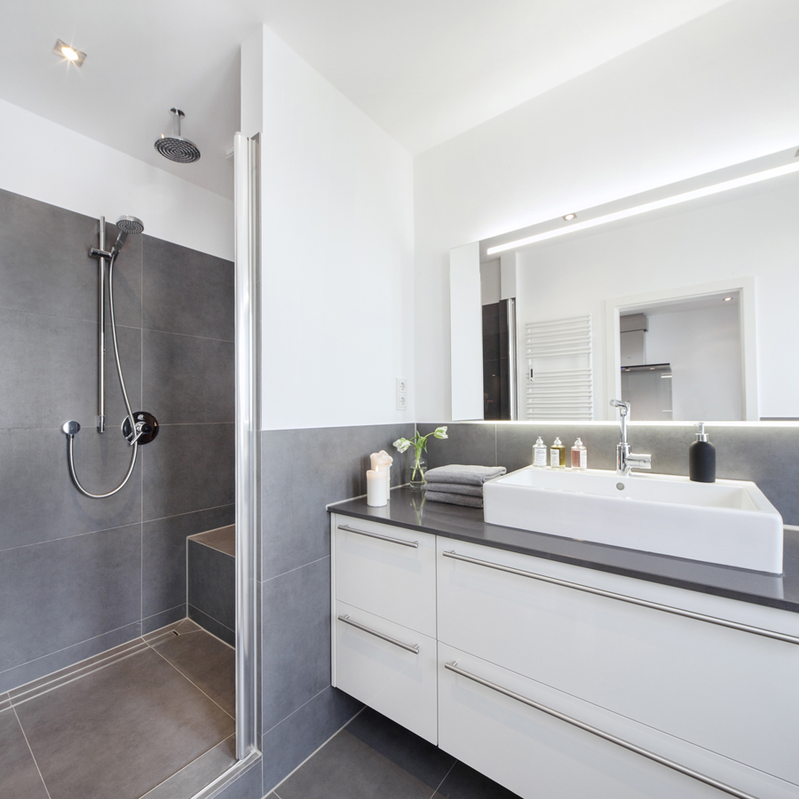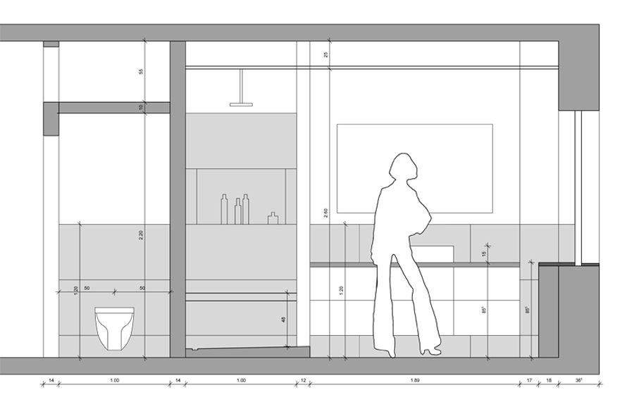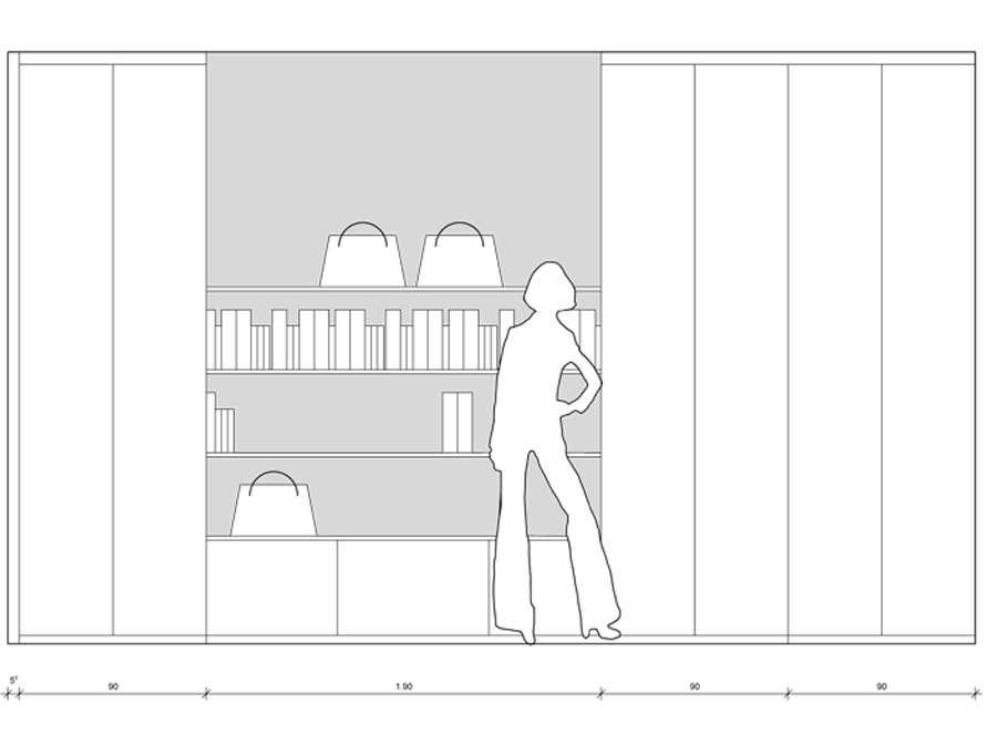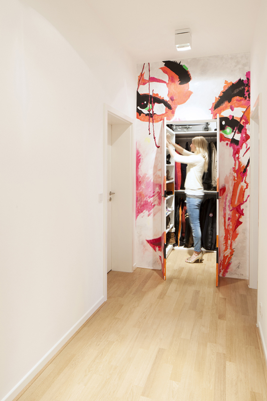 Durch gezielte Änderungen in der Erschließung, der großzügigeren Öffnung des Wohnzimmers zum Flur und der Vergrößerung der Fenster zum Südbalkon, verliert die Wohnung Ihre ursprüngliche kleinteilige Struktur aus den 50ern. Beim Betreten der Wohnung werden zuerst die vielen farbstarken Rottöne des raumhohen handgemalten Portraits erlebbar, hinter dem sich die private Sammlung aus luxuriösen Handtaschen und eleganten Schuhen versteckt. Der zweite Blick wird direkt durch das weitläufige Wohnzimmer in den großzügigen Garten gelenkt. Im Wohnzimmer sind die Rottöne deutlich dezenter gewählt und werden durch die feine Materialität der Bruchsteinwand aufgewertet. Die Küche und die Badezimmer halten sich durch eine reduzierte Farbigkeit in der Materialauswahl dezent zurück.